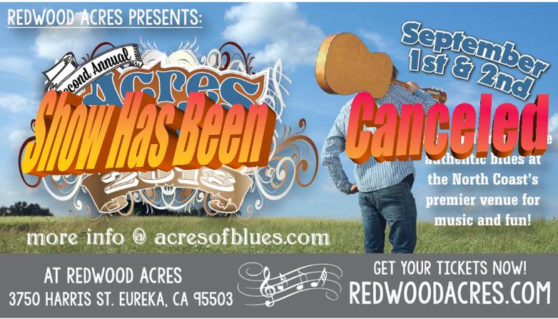 | "Acres of Blues" Our Second Annual -------- The Blues Are Back in Eureka, Ca. People are excited, the response is overwhelming and we will once again have Great Blues back in Eureka "Acres of Blues" September 1st & 2nd 2018, At the Redwood Acres Fairgrounds People from around the world have responded with a resounding YES!!! So we are bringing the Blues Back to Humboldt County. |